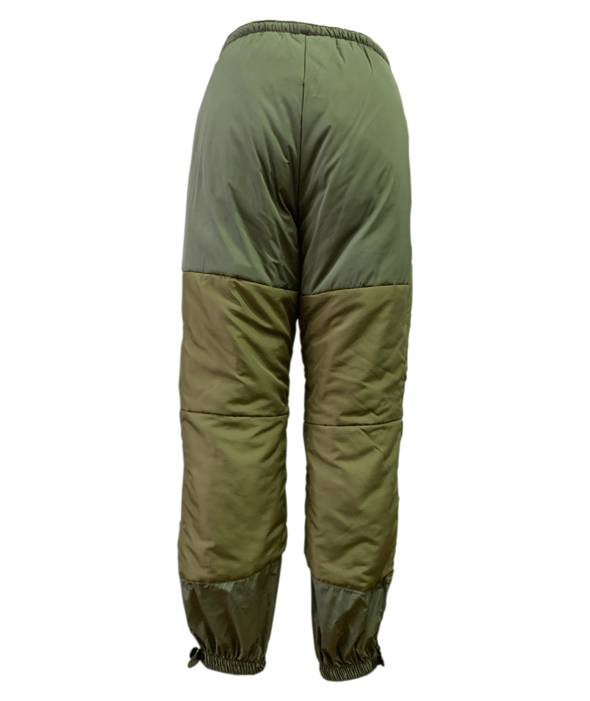 Unisex Trousers Thermal, Olive green. main face fabric:40D nylon ripstop 53gsm.RF fabric is 100% Polyester 115 gsm.Padding is Primaloft I-2011.Lining is 30D nylon plain woven 45gsm.Side seam with 2way open coil zipper.Hem have elastic system.