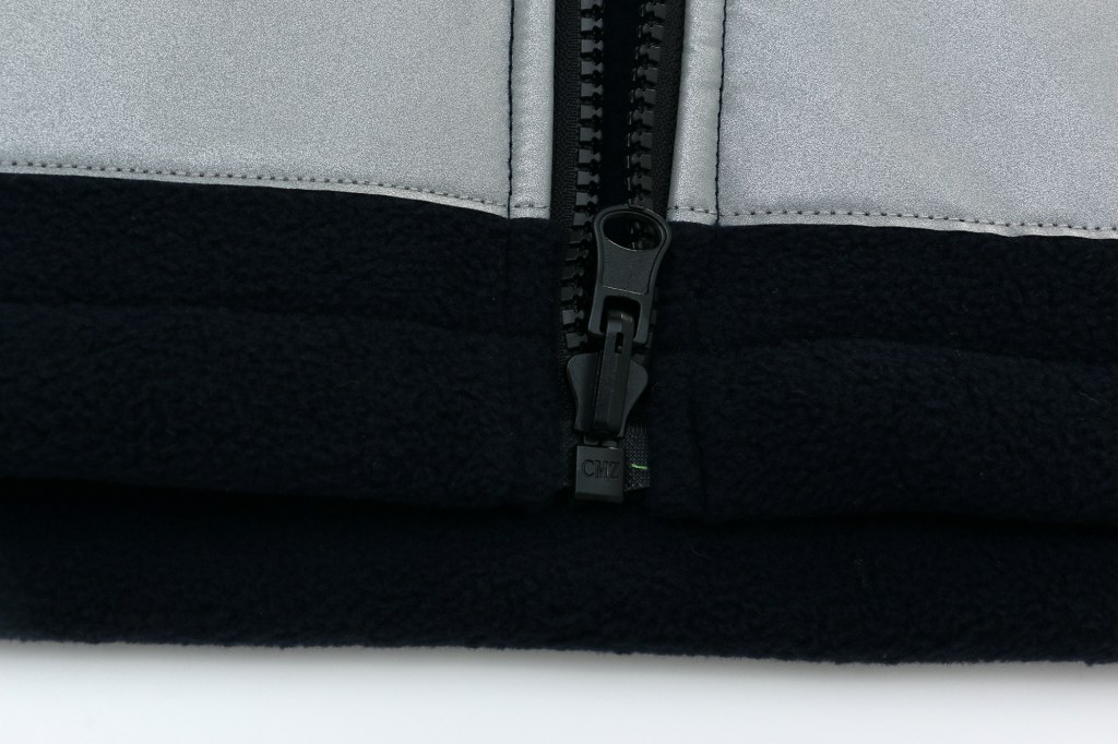Two side pockets in total: functional hand warming pockets with zippers closure. The jacket has a zippered closure, elastic sleeve cuffs. Reflective tapes in front and back view. Stand collar.