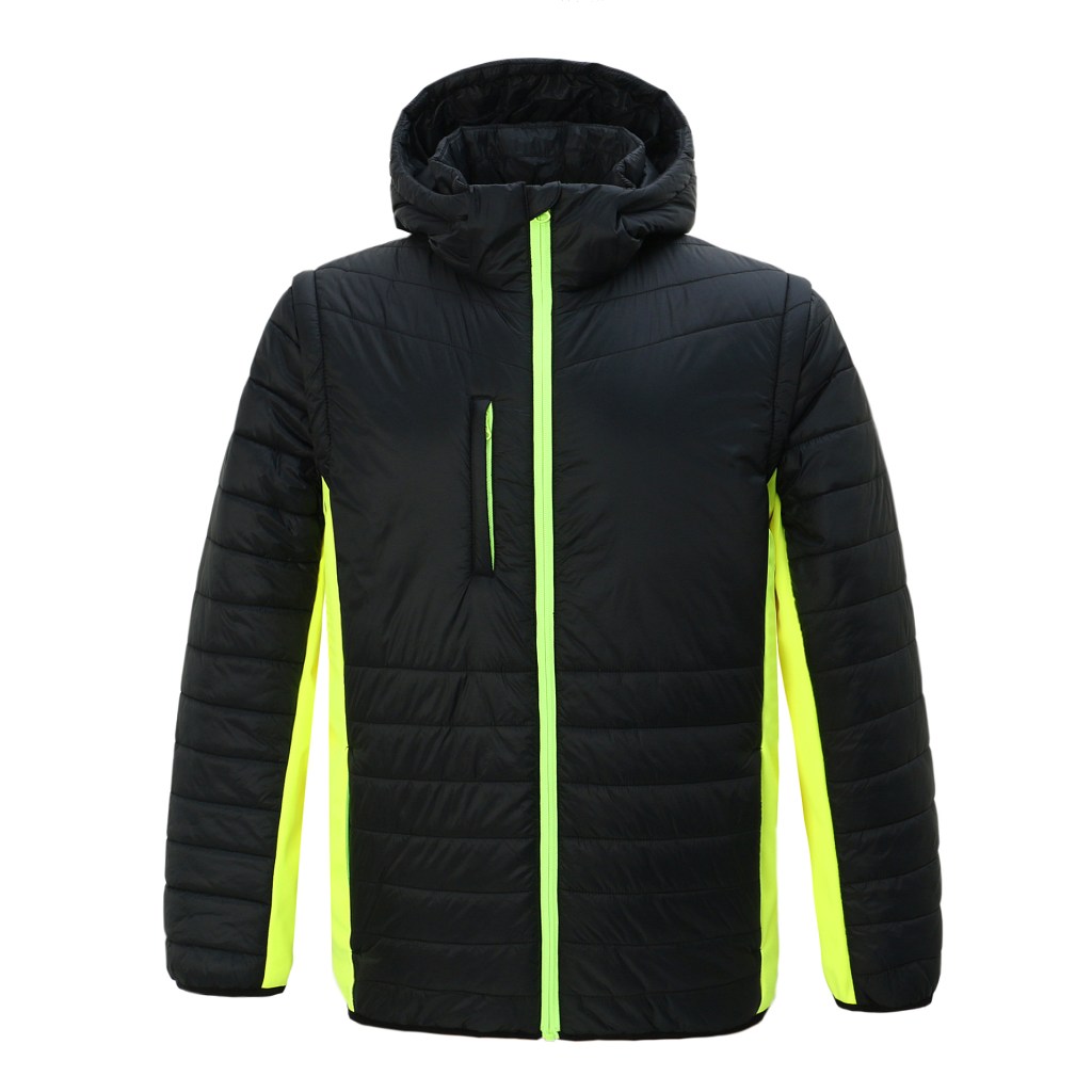 one at the chest, and two larger ones below. Jacket are warm and functional, wind and water-resistant, The jacket has a zippered CF closure. Removable hood. Elasticated bottom and sleeve cuffs.