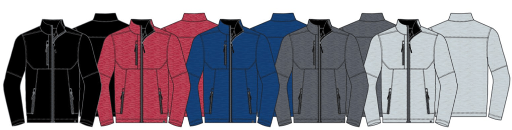 The shell fabric is recycled poly 3layer softshell.CF zipper has easy grip zipper pulls. The chest pocket and lower pocket are closed by contrast zipper.