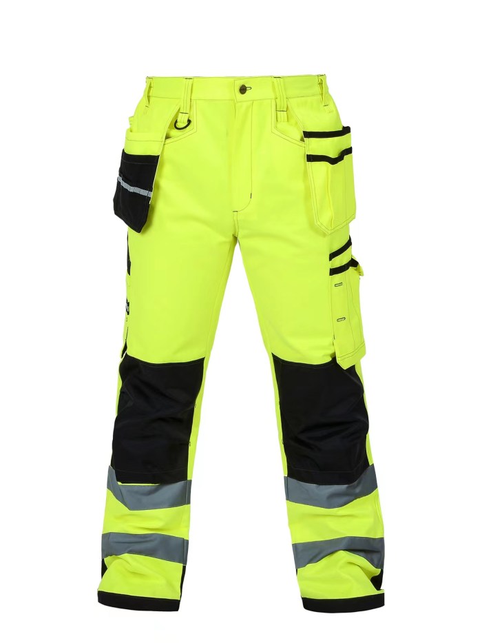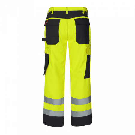 Trousers with concealed cross pockets with flaps. Two back pockets with reinforced base and pocket flaps. Hammer strap. Ruler pocket. Knee reinforcement/knee pockets with velcro closure at bottom and adjustment options for kneepad. Flame retardant reflectors. Well-thought-out design details on pockets and pleats prevent embers from adhering to the fabric. Antistatic and flame retardant and protects against liquid aerosols, spray, and splashes from chemicals. Class 2 clothing.