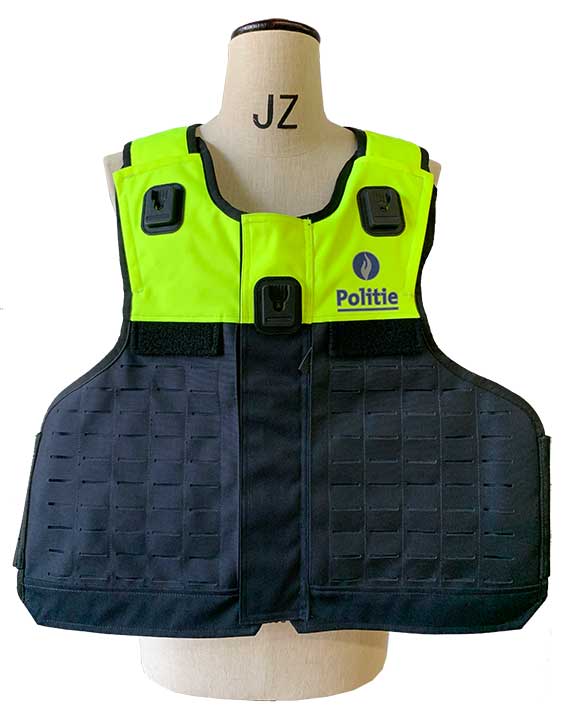 Police vest, colour in hivis yellow, shell fabric is 100% polyester 600D weight is around 300gm. The front body has a molle for attached accessories. Two radio docks on the upper body.